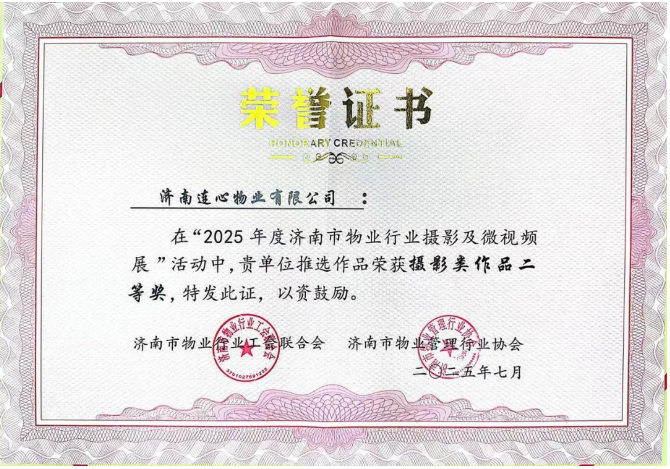 2025年7月23日,濟南市物業(yè)行業(yè)2025年度工會(huì )干部培訓班暨攝影微視頻展表?yè)P活動(dòng)在博鰲大廈舉行。濟南連心物業(yè)有限公司攝影作品《城市溫暖傳遞》榮獲二等獎。